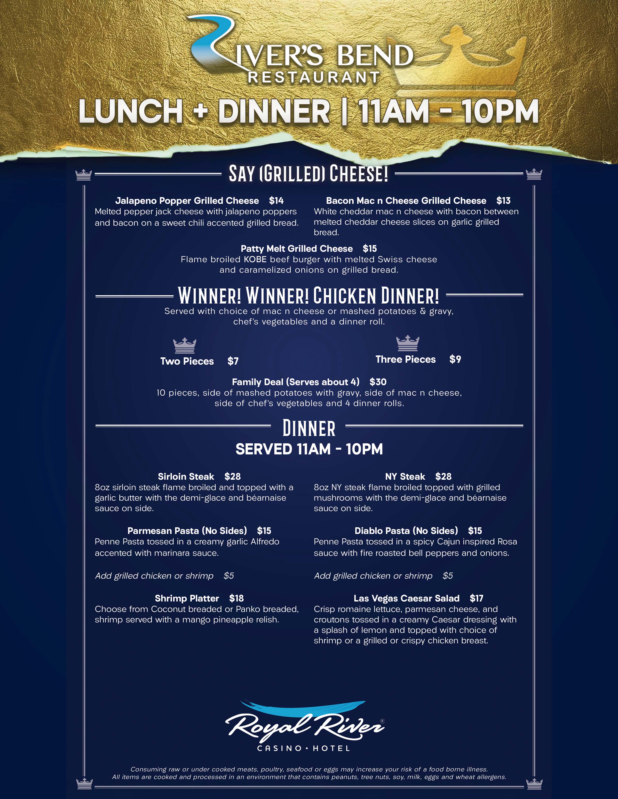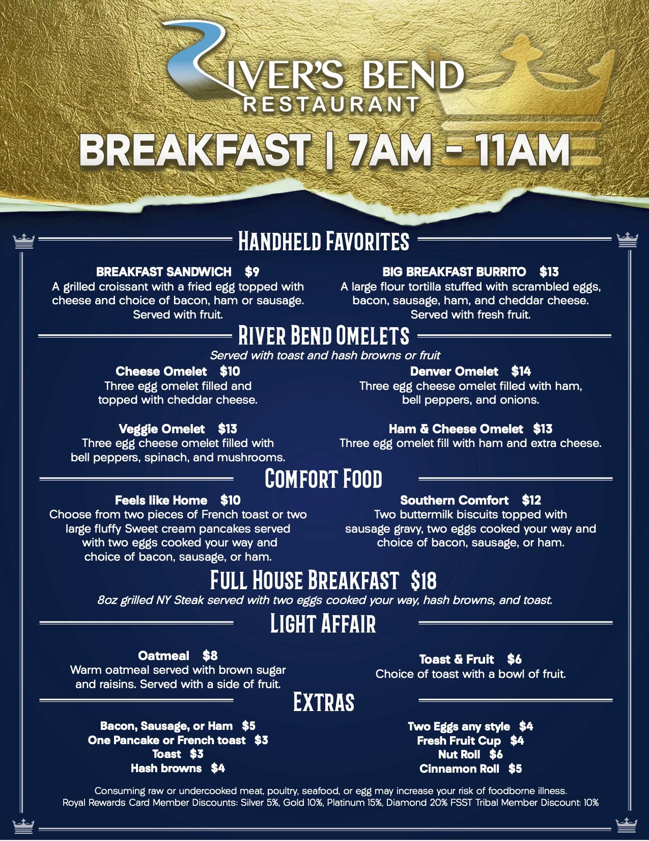 River's Bend Restaurant is open from 7 am to 2 pm, Monday-Tuesday, and 7 am to 10 pm, Wednesday-Sunday.