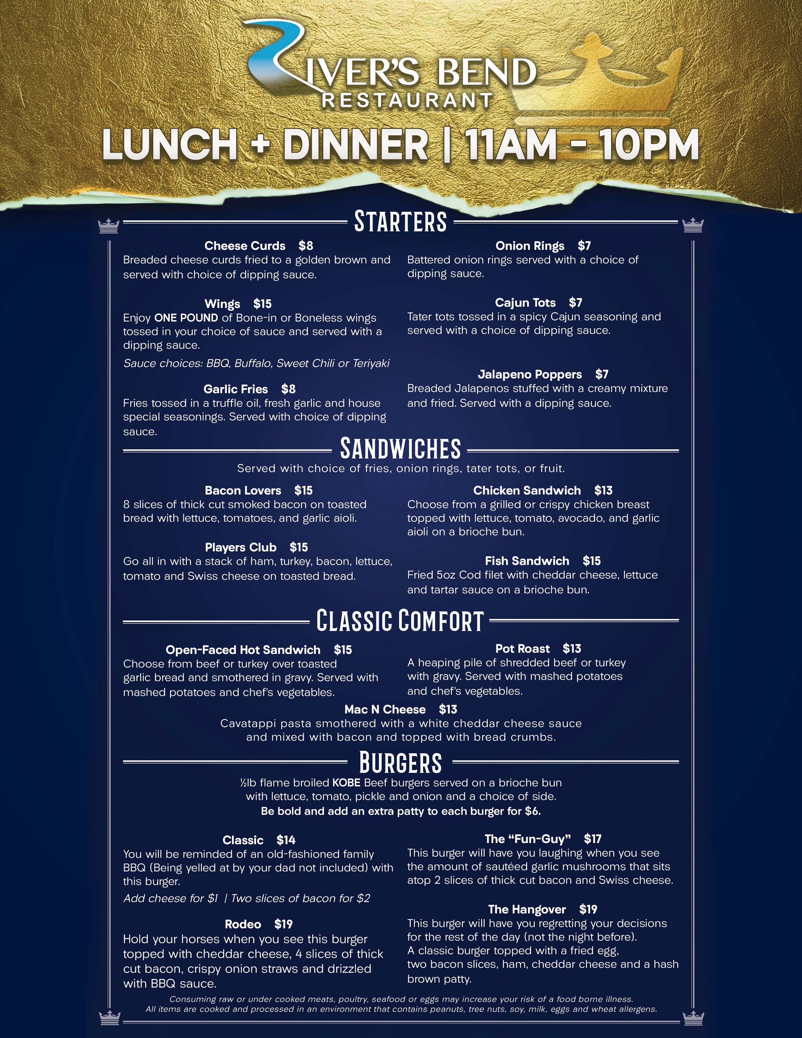 You owe it to yourself to experience River's Bend Restaurant and the fantastic new menu offering great daily specials. Looking for a quick meal? Check out our Snack Bar which features burgers, fries and more!