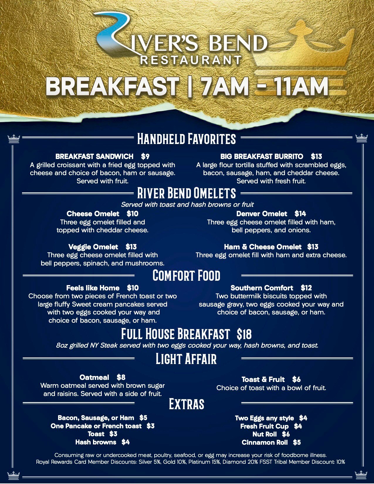 River's Bend Restaurant is open from 7 am to 2 pm, Monday-Tuesday, and 7 am to 10 pm, Wednesday-Sunday.